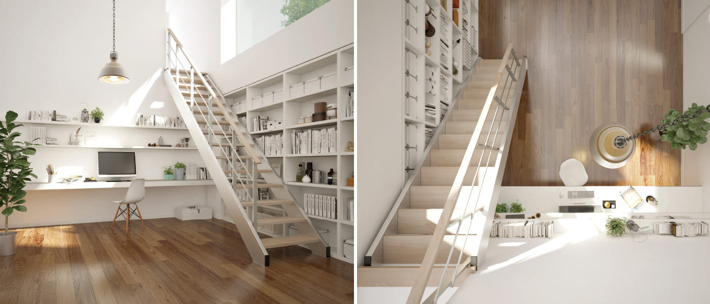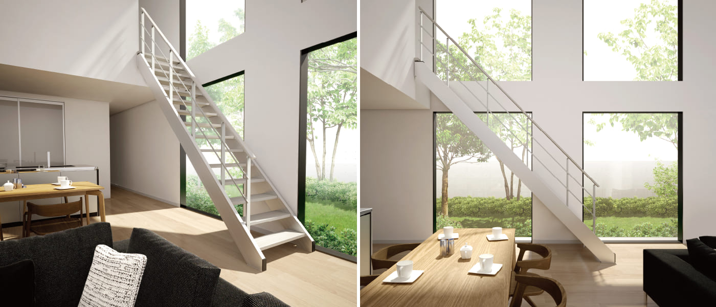 従来の箱階段では実現できない採光性の高い空間設計が可能です。やさしい自然光を取り込んだ、あたたかい空間創りを実現できます。