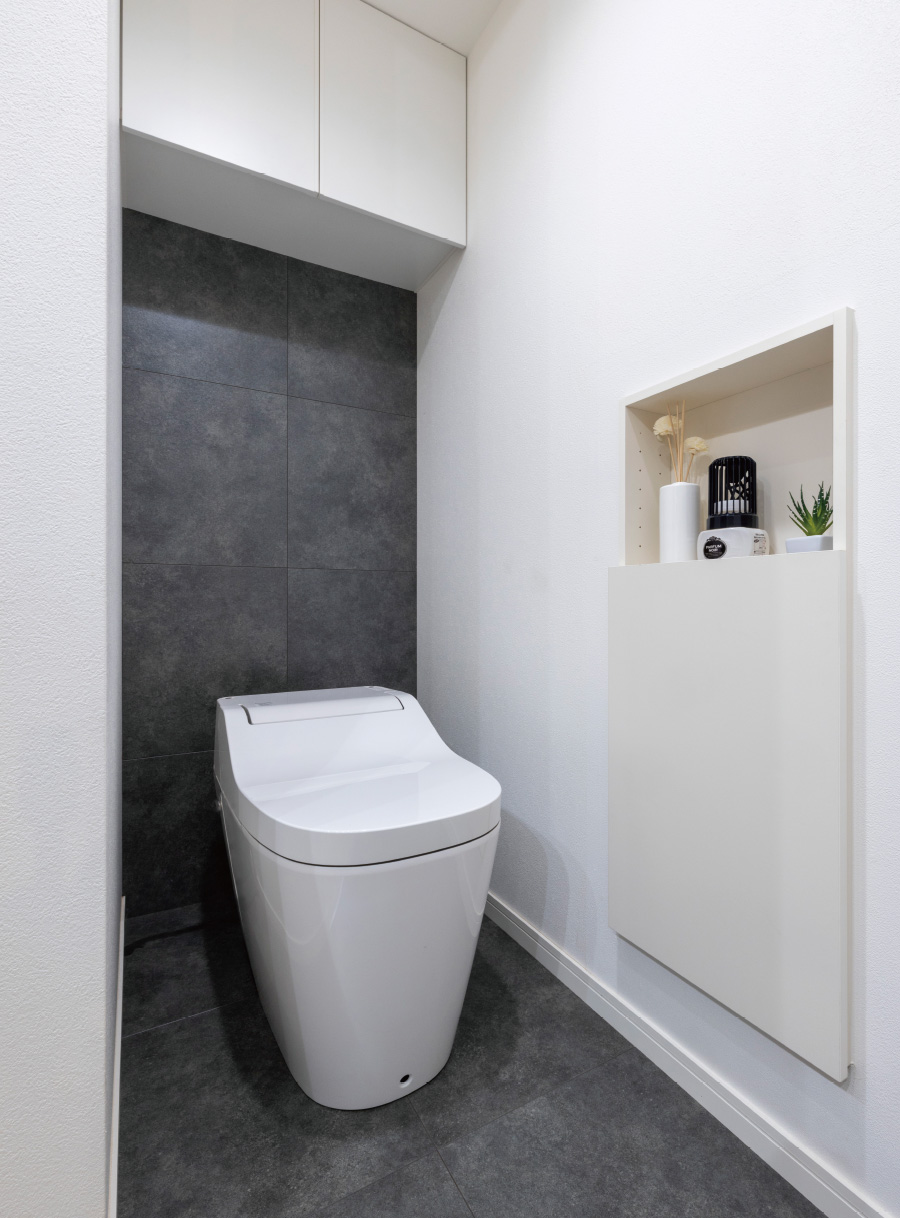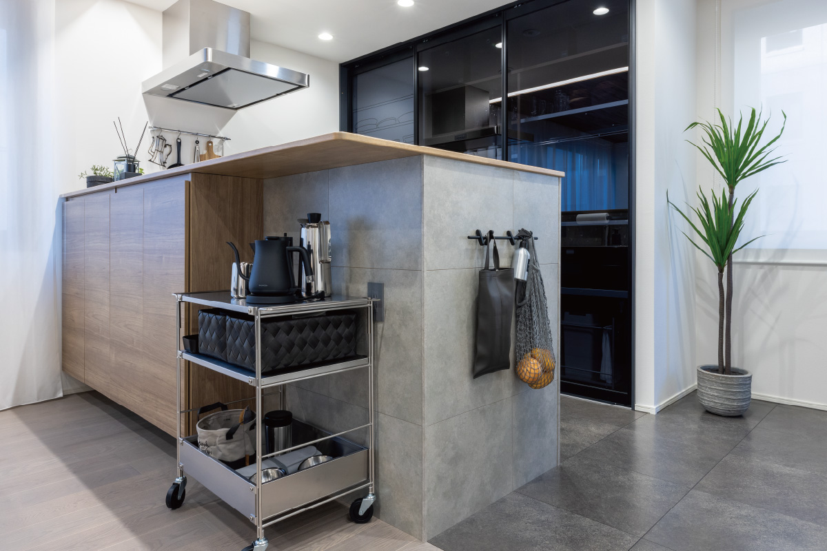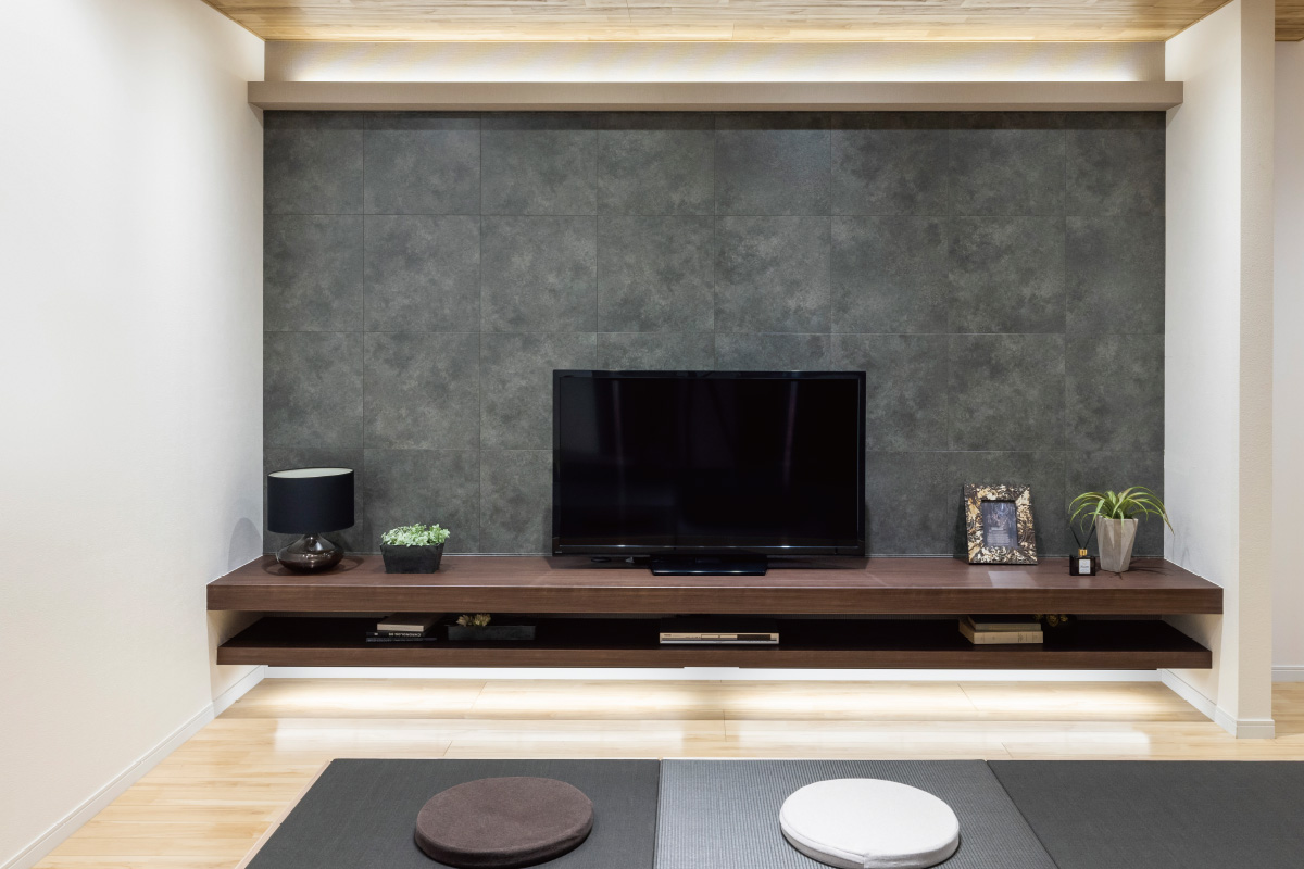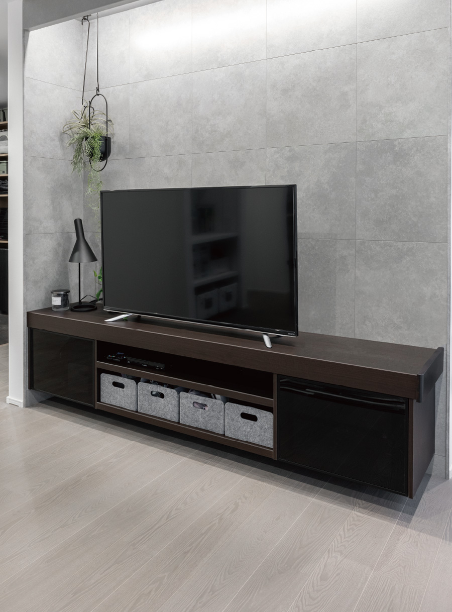 壁面を一般的なクロス仕上げからラコアにすることで、クールに空間全体の印象を引き締め、表情も豊かに演出します。